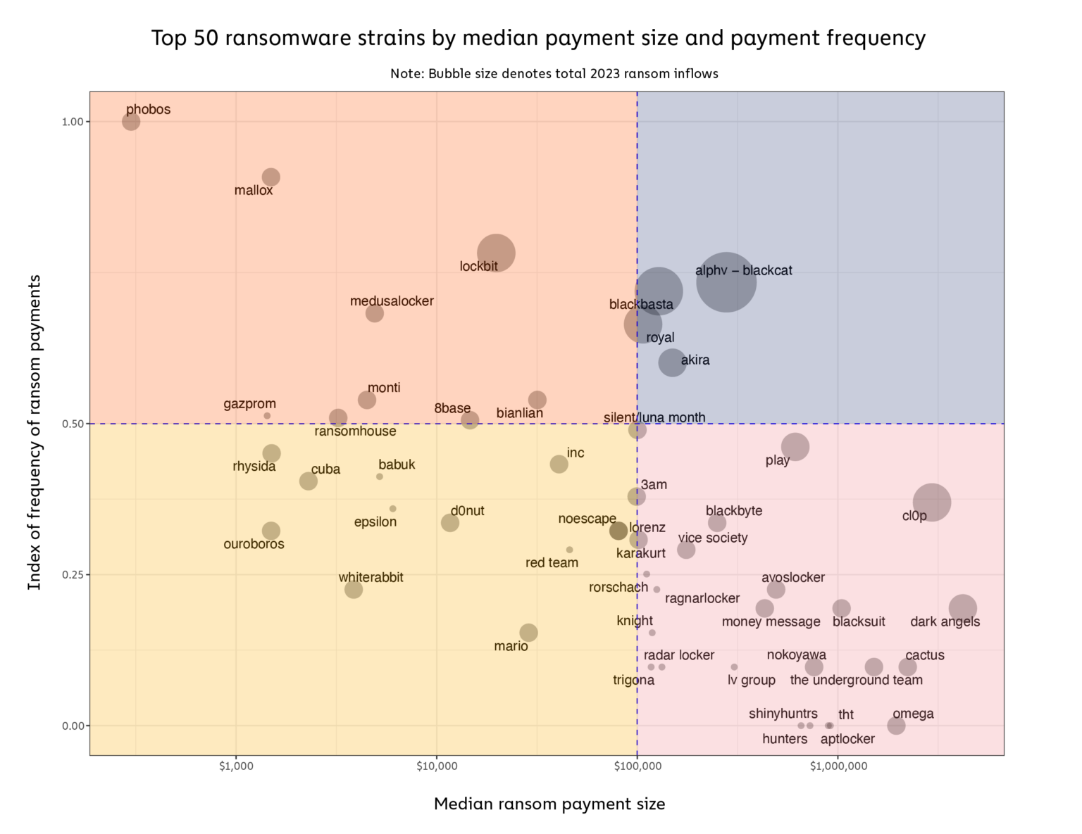 次のグラフは、支払額と支払い頻度に応じてランサムウェアの種類をマッピングしたものであり、非常に有用な情報になっています。